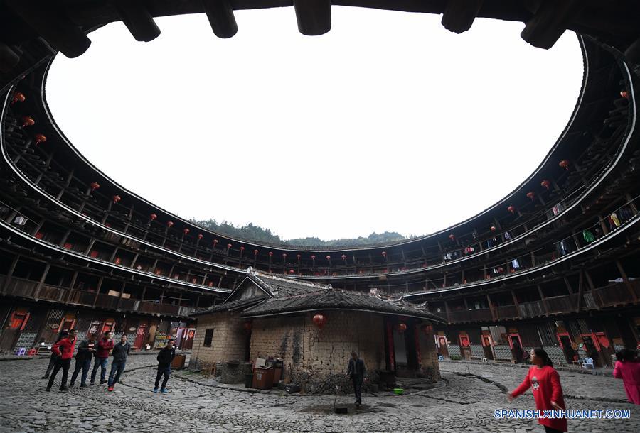 Imagen del 23 de noviembre de 2018 de una vista de un Yuchang Tulou, en la ciudad de Zhangzhou, provincia de Fujian, en el sureste de China. El Fujian Tulou, que se remonta a las Dinastías Song y Yuan, es un tipo de vivienda rural china del pueblo Hakka de las zonas monta?osas de la provincia de Fujian. La distribución del Fujian Tulou siguió la tradición de vivienda china de concepto "cerrado exteriormente, abrierto interiormente": un muro de cerramiento con viviendas alrededor del periférico y un patio común en el centro. En 2008, el Tulou fue agregado a la Lista del Patrimonio Mundial como un sitio cultural. (Xinhua/Lin Shanchuan)