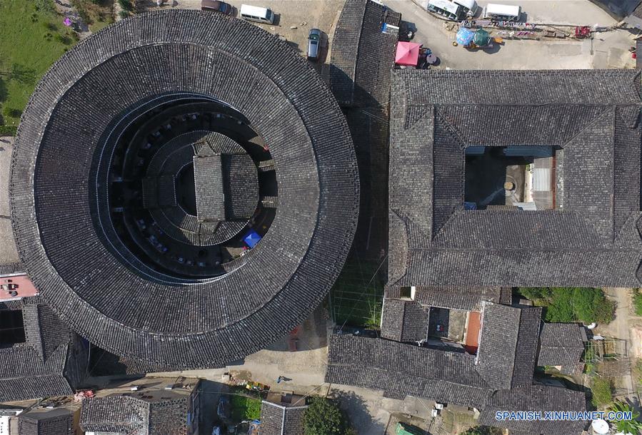 Imagen del 23 de noviembre de 2018 de una vista de un Huaiyuan Tulou (i) y un Fuyuan Tulou (d), en la villa de Kanxia, en el condado de Nanjing de la ciudad de Zhangzhou, provincia de Fujian, en el sureste de China. El Fujian Tulou, que se remonta a las Dinastías Song y Yuan, es un tipo de vivienda rural china del pueblo Hakka de las zonas monta?osas de la provincia de Fujian. La distribución del Fujian Tulou siguió la tradición de vivienda china de concepto "cerrado exteriormente, abrierto interiormente": un muro de cerramiento con viviendas alrededor del periférico y un patio común en el centro. En 2008, el Tulou fue agregado a la Lista del Patrimonio Mundial como un sitio cultural. (Xinhua/Lin Shanchuan)