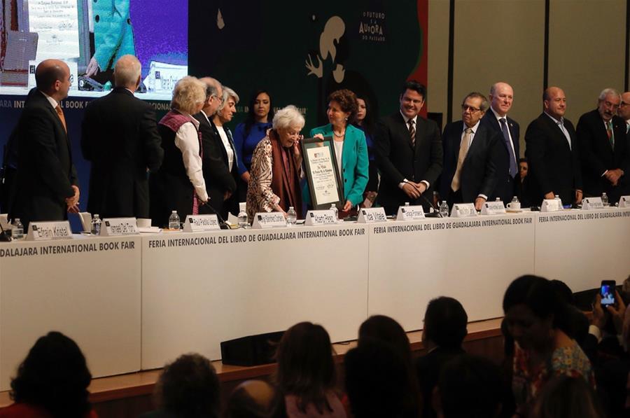 La poeta uruguaya Ida Vitale (6-i), recibe el Premio FIL de Literatura en Lenguas Romances, durante el evento inaugural de la 32 Feria Internacional del Libro de Guadalajara (FILG), en la ciudad de Guadalajara, estado de Jalisco, México, el 24 de noviembre de 2018. La ganadora del Premio Cervantes 2018, la poeta uruguaya Ida Vitale, fue galardonada con el Premio FIL de Literatura en Lenguas Romances el sábado durante la inauguración de la FILG. En esta edición la feria tiene como invitado de honor a Portugal, de acuerdo con información de la prensa local. (Xinhua/Bernardette Gómez)