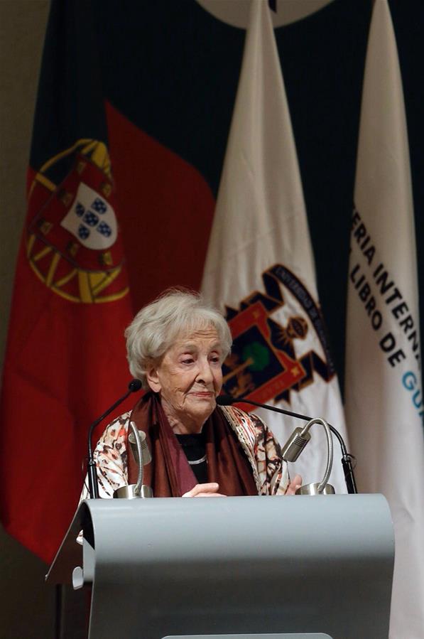 GUADALAJARA, noviembre 24, 2018 (Xinhua) -- La poeta uruguaya Ida Vitale, pronuncia un discurso durante el evento inaugural de la 32 Feria Internacional del Libro de Guadalajara (FILG), en la ciudad de Guadalajara, estado de Jalisco, México, el 24 de noviembre de 2018. La ganadora del Premio Cervantes 2018, la poeta uruguaya Ida Vitale, fue galardonada con el Premio FIL de Literatura en Lenguas Romances el sábado durante la inauguración de la FILG. En esta edición la feria tiene como invitado de honor a Portugal, de acuerdo con información de la prensa local. (Xinhua/Bernardette Gómez)