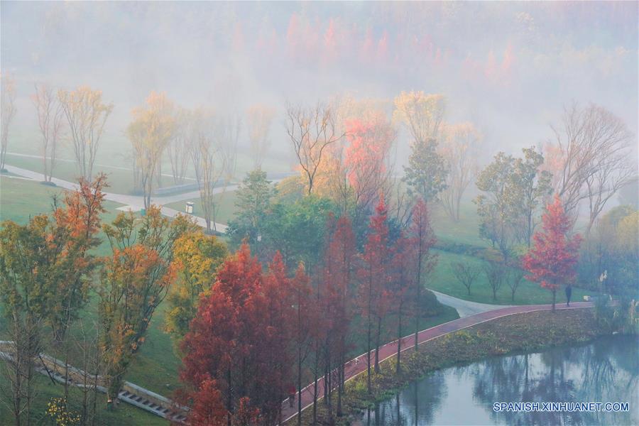 Vista de un parque cubierto por niebla en el distrito de Guanshanhu, en Guiyang, capital de la provincia de Guizhou, en el suroeste de China, el 26 de noviembre de 2018. (Xinhua/Liu Xu)