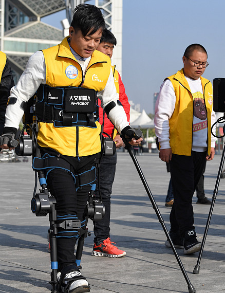 Shao Haipeng camina en el Parque Olímpico de Beijing con su exoesqueleto robótico. Shao completó una distancia equivalente a una maratón completa. (Foto: Hao Yi/ China Daily)