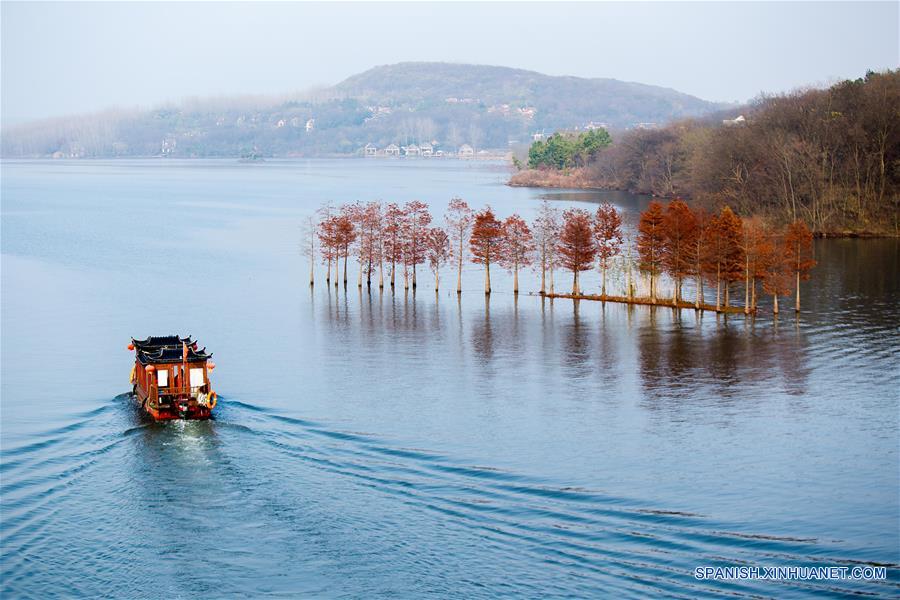 Turistas visitan Vista el lago Tianquan a bordo de un bote, en el condado de Xuyi, provincia de Jiangsu, en el este de China, el 24 de noviembre de 2018. (Xinhua/Tang Dehong)