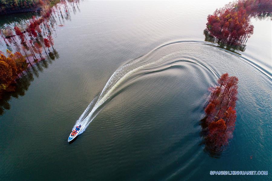 JIANGSU, noviembre 24, 2018 (Xinhua) -- Vista de una lancha rápida navegando en el lago Tianquan, en el condado de Xuyi, provincia de Jiangsu, en el este de China, el 24 de noviembre de 2018. (Xinhua/Tang Dehong)
