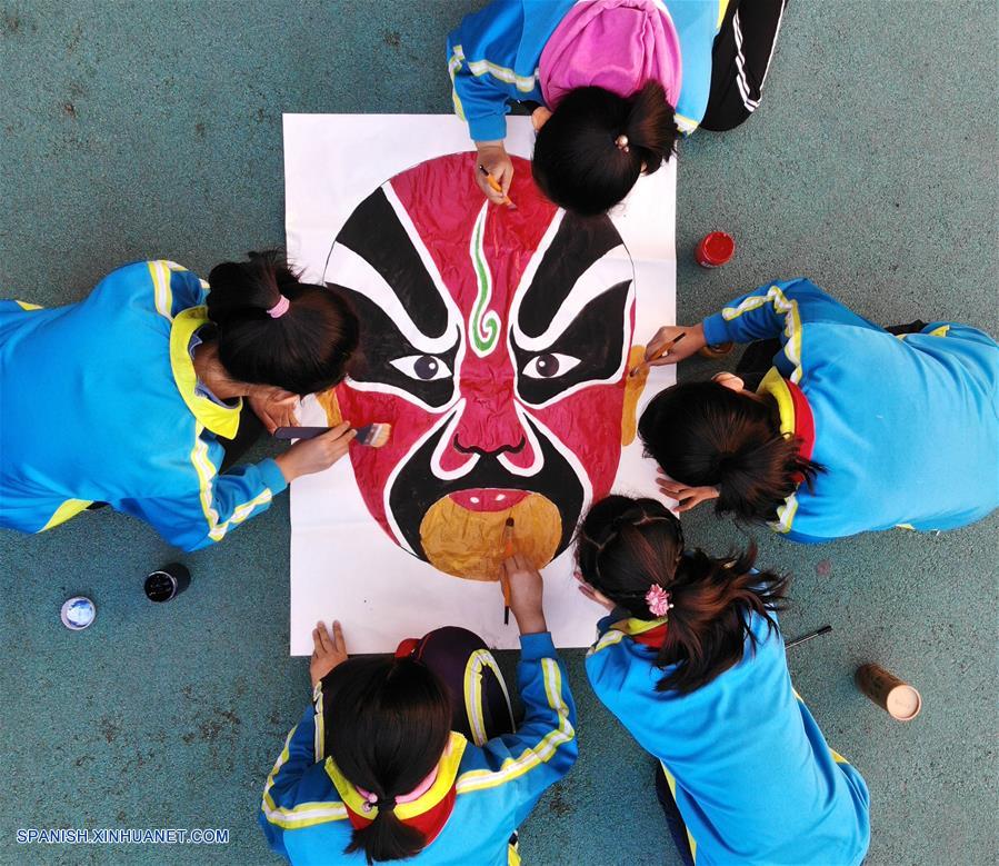 HEBEI, noviembre 28, 2018 (Xinhua) -- Vista aérea de estudiantes pintando una máscara de ópera tradicional en la Escuela Primaria Jialeyuan, en el distrito de Qiaodong de la ciudad de Xingtai, provincia de Hebei, en el norte de China, el 28 de noviembre de 2018. En los últimos a?os, el distrito de Qiaodong de la ciudad de Xingtai ha organizado varias actividades para dar a conocer la cultura tradicional en las escuelas para que los estudiantes sientan el encanto de la cultura tradicional y estimulen sus interés en el aprendizaje. (Xinhua/Mu Yu)