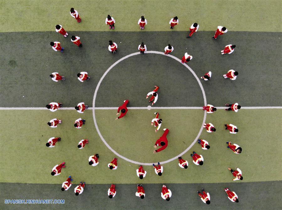 HEBEI, noviembre 28, 2018 (Xinhua) -- Vista aérea de estudiantes aprendiendo Taiji bajo la guía de instructores en la Escuela Primaria Nanchen, en el distrito de Qiaodong de la ciudad de Xingtai, provincia de Hebei, en el norte de China, el 28 de noviembre de 2018. En los últimos a?os, el distrito de Qiaodong de la ciudad de Xingtai ha organizado varias actividades para dar a conocer la cultura tradicional en las escuelas para que los estudiantes sientan el encanto de la cultura tradicional y estimulen sus intereses de aprendizaje. (Xinhua/Mu Yu)