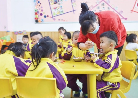 Una maestra alimenta a un ni?o en un jardín de la infancia de Shishi, provincia de Fujian. (Foto: Xinhua)