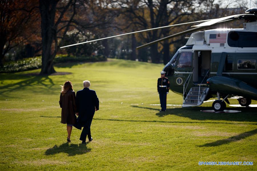 El presidente de Estados Unidos, Donald Trump (d) y la primera dama Melania Trump, salen de la Casa Blanca en Washington D.C., Estados Unidos, el 29 de noviembre de 2018. El presidente de Estados Unidos, Donald Trump, dijo el jueves que considerando la confrontación sin resolver entre Rusia y Ucrania, ha decidido que sería mejor cancelar la reunión prevista con el presidente ruso, Vladimir Putin. (Xinhua/Ting Shen)