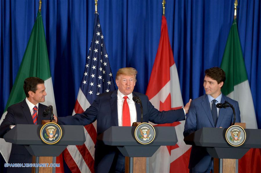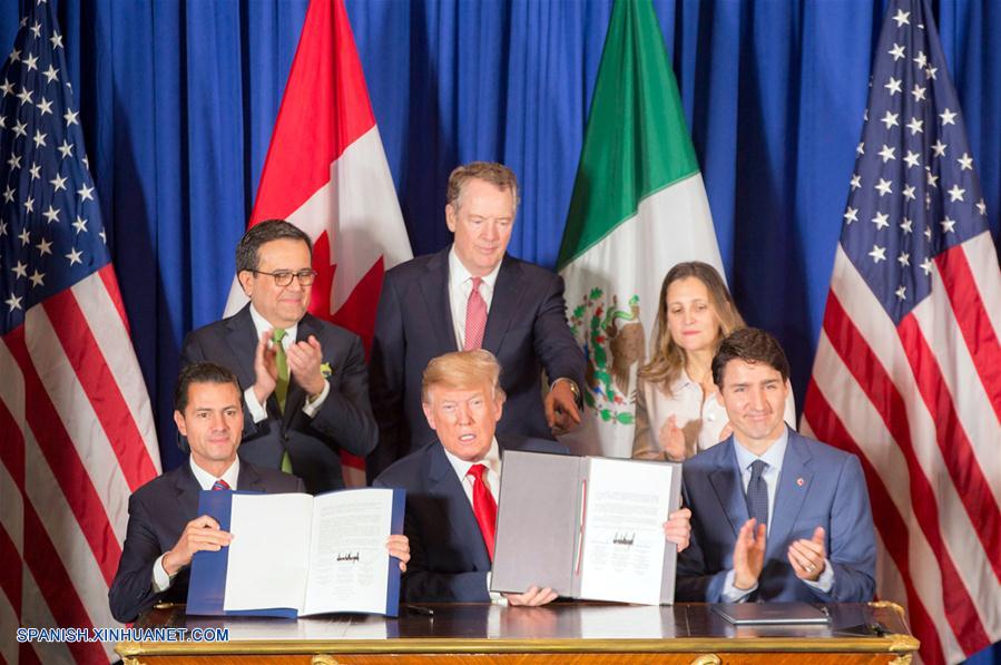 El primer ministro de Canadá, Justin Trudeau; el presidente de Estados Unidos, Donald Trump; y su homólogo mexicano, Enrique Pe?a Nieto, atestiguaron la firma del nuevo tratado en Buenos Aires, al margen de la Cumbre de Líderes del G20.