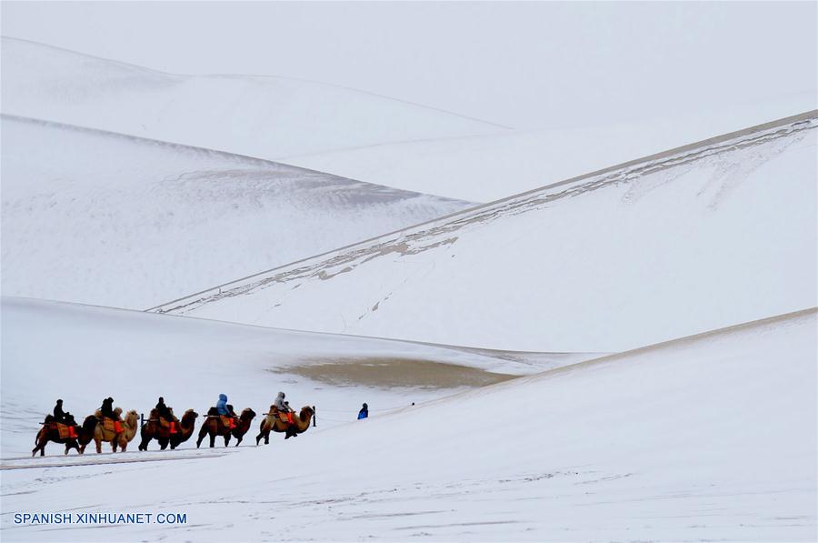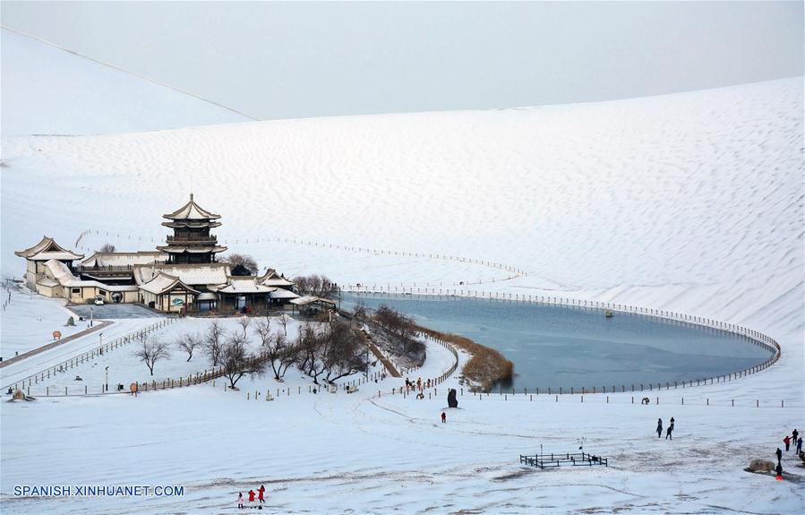 DUNHUANG, diciembre 2, 2018 (Xinhua) -- Personas visitan el nevado punto escénico del Manantial de la Media Luna y la Monta?a Mingsha, en Dunhuang, en la provincia de Gansu, en el noroeste de China, el 2 de diciembre de 2018. La nevada en el punto escénico ha hecho más atractivo al lugar. (Xinhua/Zhang Xiaoliang)