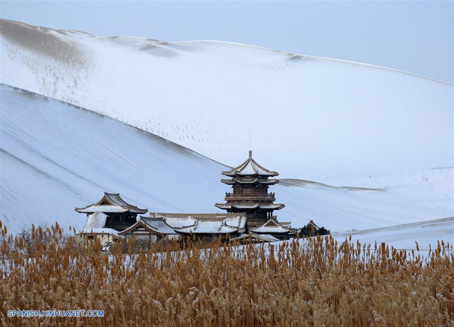 DUNHUANG, diciembre 2, 2018 (Xinhua) -- Vista del paisaje nevado del punto escénico del Manantial de la Media Luna y la Monta?a Mingsha, en Dunhuang, en la provincia de Gansu, en el noroeste de China, el 2 de diciembre de 2018. La nevada en el punto escénico ha hecho más atractivo al lugar. (Xinhua/Zhang Xiaoliang)