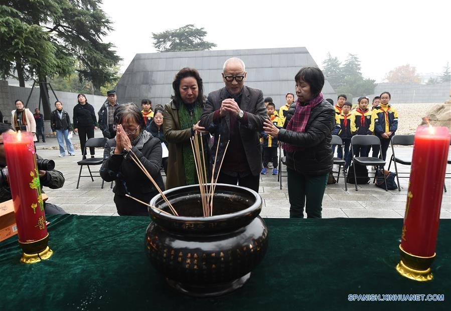 Desde hoy lunes, familiares de las víctimas de la matanza empezaron una serie de actividades conmemorativas, como colocar arreglos florales, quemar incienso y leer cartas frente a la pared del pabellón conmemorativo donde están grabados los nombres de las víctimas, en Nanjing, la capital de la provincia oriental china de Jiangsu.