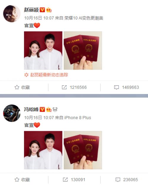 Contexto: Los anuncios oficiales y las palabras populares de internet son un estilo. El 16 de octubre de 2018, Zhao Liying y Feng Shaofeng realizaron una publicación en sus microblogs de Weibo al mismo tiempo: "Anuncio oficial", con un corazón rojo detrás, una foto de la boda y el certificado de matrimonio. Desde entonces, la palabra “anuncio oficial” se ha convertido en una expresión popular.