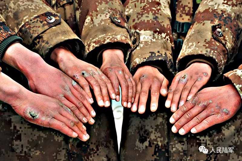 Los soldados de la patrulla fronteriza muestran sus manos desfiguradas. [Foto: cuenta del ejército en WeChat]