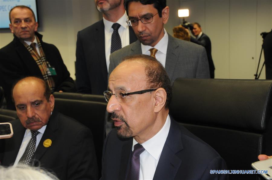 El ministro de Energía de Arabia Saudita, Khalid Al-Falih (d), es entrevistado previo a la reunión a puerta cerrada de la Organización de Países Exportadores de Petróleo (OPEP) en Viena, Austria, el 6 de diciembre de 2018. (Xinhua/Liu Xiang)