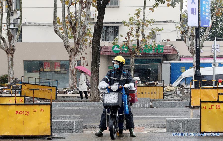 Un hombre entrega alimentos bajo la nevada, en Shanghai, en el este de China, el 8 de diciembre de 2018. Una nevada afectó la ciudad el sábado. (Xinhua/Fang Zhe)