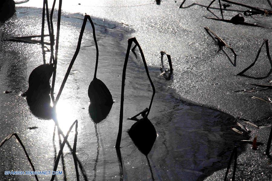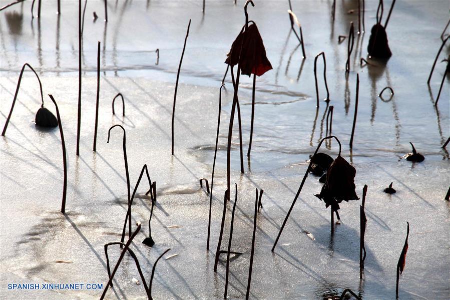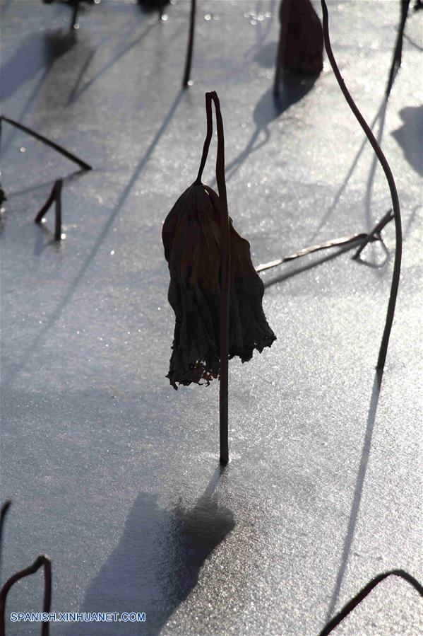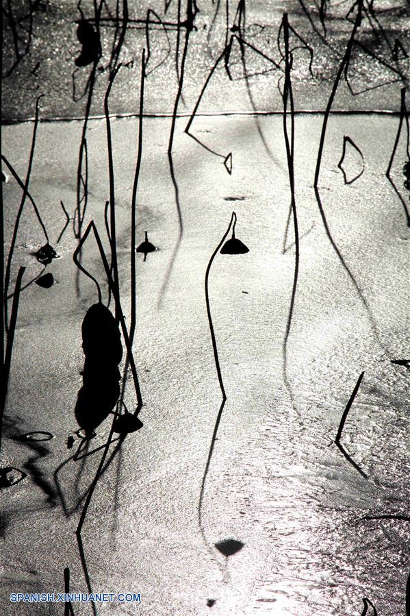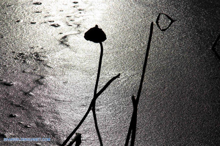 SHANDONG, diciembre 9, 2018 (Xinhua) -- Imagen del 8 de diciembre de 2018, de una vista de lotos marchitos en el condado de Wudi de Binzhou, en la provincia de Shandong, en el este de China. (Xinhua/Chu Baorui)