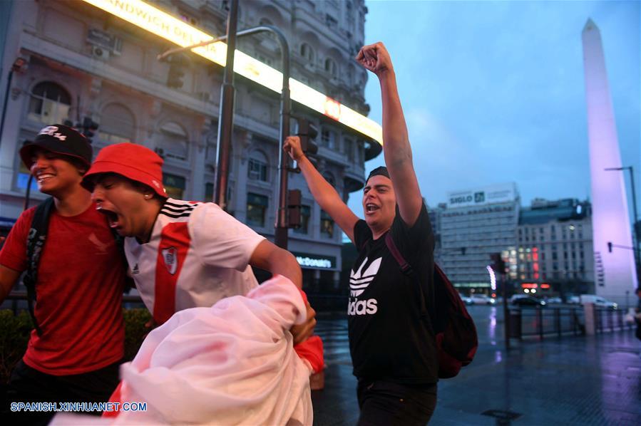 BUENOS AIRES, diciembre 9, 2018 (Xinhua) -- Imagen proveída por la agencia de noticias Télam de aficionados de River Plate festejando al término del partido de la final de la Copa Libertadores 2018 ante Boca Juniors, frente al Obelisco, en Buenos Aires, Argentina, el 9 de diciembre de 2018. (Xinhua/Fernando Gens/TELAM)