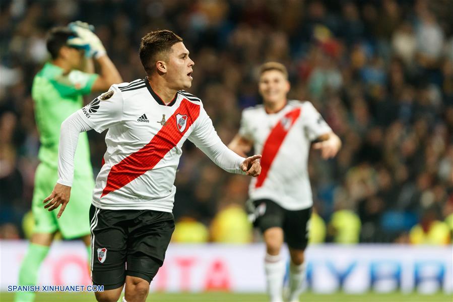MADRID, diciembre 9, 2018 (Xinhua) -- Imagen proveída por la Agencia de Noticias del Estado Mexicano Notimex, del jugador Juan Quintero (i), de River Plate festejando durante el partido de la final de la Copa Libertadores 2018, ante Boca Juniors, celebrado en el Estadio Santiago Bernabéu, en Madrid, Espa?a, el 9 de diciembre de 2018. (Xinhua/Juan Carlos Rojas/NOTIMEX)