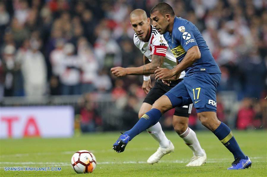 MADRID, diciembre 9, 2018 (Xinhua) -- Imagen proveída por la Agencia de Noticias del Estado Mexicano Notimex, del jugador Jonathan Maidana (i), de River Plate, disputando el balón con Ramón Abila (d), de Boca Juniors, durante el partido de la final de la Copa Libertadores 2018, celebrado en el Estadio Santiago Bernabéu, en Madrid, Espa?a, el 9 de diciembre de 2018. (Xinhua/Juan Carlos Rojas/NOTIMEX)