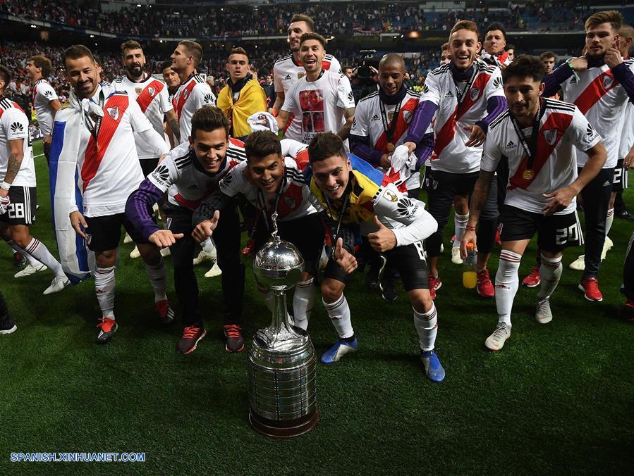 MADRID, diciembre 9, 2018 (Xinhua) -- Imagen proveída por la agencia de noticias Télam de jugadores de River Plate celebrando al término del partido de la final de la Copa Libertadores 2018, ante Boca Juniors, celebrado en el Estadio Santiago Bernabéu, en Madrid, Espa?a, el 9 de diciembre de 2018. (Xinhua/José Romero/TELAM)