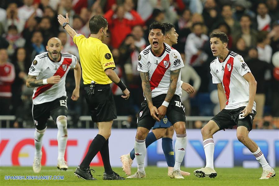 MADRID, diciembre 9, 2018 (Xinhua) -- Imagen proveída por la Agencia de Noticias del Estado Mexicano Notimex, del jugador Enzo Pérez (c), de River Plate, reaccionando durante el partido de la final de la Copa Libertadores 2018, ante Boca Juniors, celebrado en el Estadio Santiago Bernabéu, en Madrid, Espa?a, el 9 de diciembre de 2018. (Xinhua/Juan Carlos Rojas/NOTIMEX)