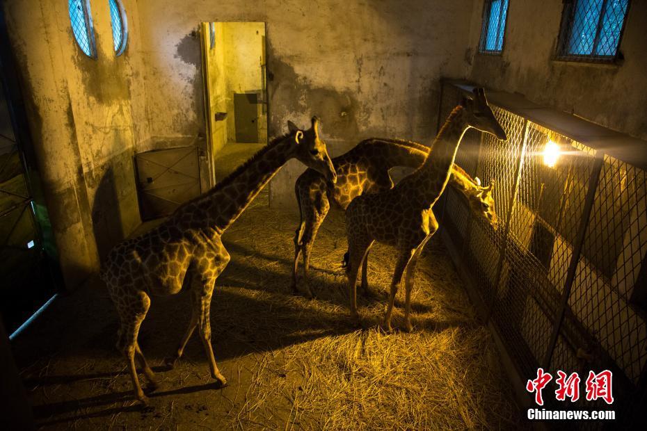 La imagen muestra el habitáculo con calentadores de las jirafas, cubierta con heno para evitar la artritis. Por Zhang Chang, Agencia de Noticias de China.