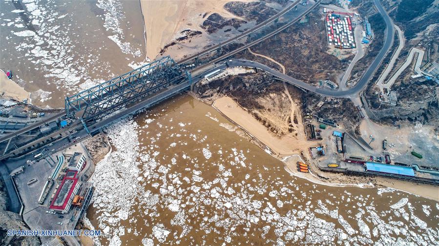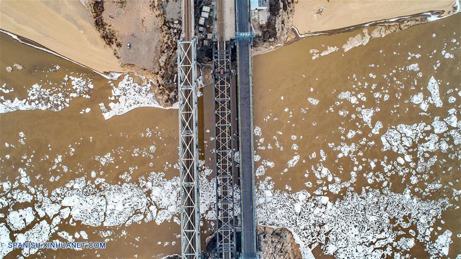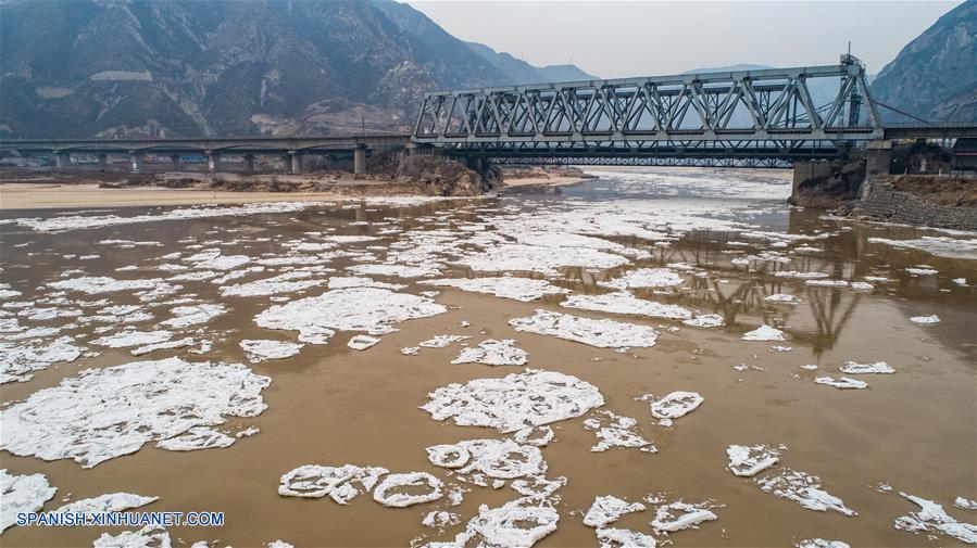 SHANXI, diciembre 10, 2018 (Xinhua) -- Vista aérea del 9 de diciembre de 2018 de trozos de hielo flotando sobre la sección Yumenkou del Río Amarillo, en la ciudad Hejin, en la provincia de Shanxi, en el norte de China. En más de 30 kilómetros a lo largo del Río Amarillo en la ciudad de Hejin, se registraron trozos de hielo flotando, debido a un reciente frente frío. (Xinhua/Xue Jun)