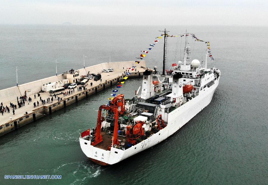 QINGDAO, diciembre 10, 2018 (Xinhua) -- El buque de investigación chino Dayang Yihao (Océano No. 1) se retira del puerto de Qingdao, en la provincia de Shandong, en el este de China, el 10 de diciembre de 2018. El buque de investigación chino Dayang Yihao (Océano No. 1) zarpó el lunes de la ciudad oriental de Qingdao para llevar a investigadores en una expedición oceánica científica de 230 días. (Xinhua/Li Ziheng)