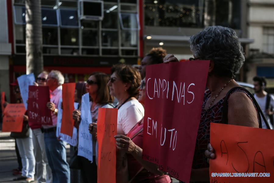 SAO PAULO, diciembre 11, 2018 (Xinhua) -- Manifestantes sostienen carteles en solidaridad con las víctimas que murieron en la Catedral de Campinas, lugar donde se registró un tiroteo, en la ciudad de Campinas, en el estado de Sao Paulo, Brasil, el 11 de diciembre de 2018. Al menos cuatro personas fueron asesinadas el martes a balazos por un hombre, quien en plena misa les disparó dentro de la Catedral de Campinas, en el estado brasile?o de Sao Paulo, para luego suicidarse, informaron autoridades locales. El cuerpo de Bomberos de la localidad explicó que el incidente se registró el martes durante la misa del mediodía, cuando un hombre de alrededor de 35 a?os disparó por lo menos en 20 ocasiones contra los asistentes, para luego suicidarse cerca del altar. (Xinhua/Rahel Patrasso)