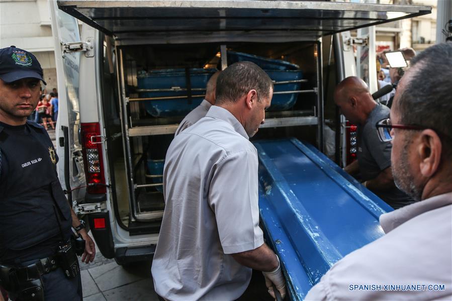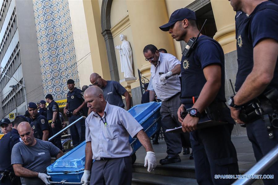SAO PAULO, diciembre 11, 2018 (Xinhua) -- Empleados municipales trasladan el cuerpo de una víctima en la Catedral de Campinas, lugar donde se registró un tiroteo, en la ciudad de Campinas, en el estado de Sao Paulo, Brasil, el 11 de diciembre de 2018. Al menos cuatro personas fueron asesinadas el martes a balazos por un hombre, quien en plena misa les disparó dentro de la Catedral de Campinas, en el estado brasile?o de Sao Paulo, para luego suicidarse, informaron autoridades locales. El cuerpo de Bomberos de la localidad explicó que el incidente se registró el martes durante la misa del mediodía, cuando un hombre de alrededor de 35 a?os disparó por lo menos en 20 ocasiones contra los asistentes, para luego suicidarse cerca del altar. (Xinhua/Rahel Patrasso)