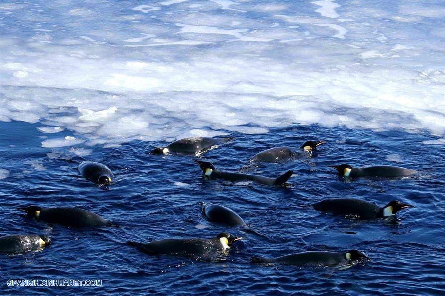 A BORDO DEL XUELONG, diciembre 10, 2018 (Xinhua) -- Imagen del 5 de diciembre de 2018 de pingüinos emperador nadando cerca del rompehielos de investigación Xuelong de China, en la Antártida. El rompehielos de investigación Xuelong de China, también conocido como Dragón de Nieve, está ahora a 44 kilómetros de la estación Zhongshan. Las operaciones de descarga se llevaron a cabo una vez determinadas las rutas de transporte. (Xinhua/Liu Shiping)