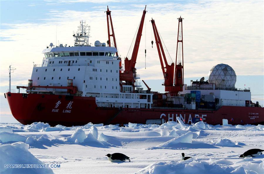 A BORDO DEL XUELONG, diciembre 10, 2018 (Xinhua) -- Imagen del 5 de diciembre de 2018 de pingüinos emperador cerca del rompehielos de investigación Xuelong de China, en la Antártida. El rompehielos de investigación Xuelong de China, también conocido como Dragón de Nieve, está ahora a 44 kilómetros de la estación Zhongshan. Las operaciones de descarga se llevaron a cabo una vez determinadas las rutas de transporte. (Xinhua/Liu Shiping)