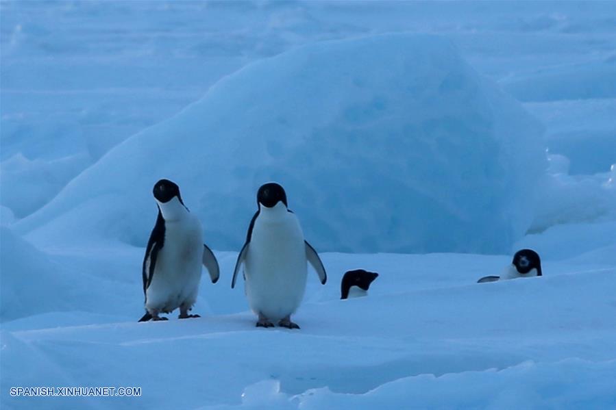 A BORDO DEL XUELONG, diciembre 10, 2018 (Xinhua) -- Imagen del 2 de diciembre de 2018 de pingüinos adelaida cerca del rompehielos de investigación Xuelong de China, en la Antártida. El rompehielos de investigación Xuelong de China, también conocido como Dragón de Nieve, está ahora a 44 kilómetros de la estación Zhongshan. Las operaciones de descarga se llevaron a cabo una vez determinadas las rutas de transporte. (Xinhua/Liu Shiping)