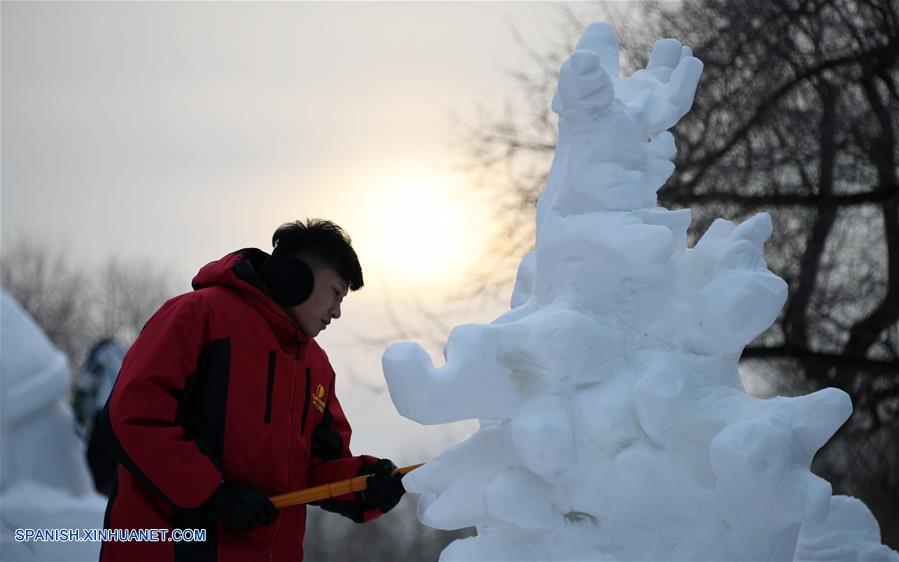 HEILONGJIANG, diciembre 12, 2018 (Xinhua) -- Un concursante talla una escultura de nieve durante el 6 Concurso de Escultura de Nieve de Estudiantes Universitarios de la provincia de Heilongjiang, en el Parque Internacional de Exposiciones de Arte de Escultura de Nieve Isla del Sol, en Harbin, capital de la provincia de Heilongjiang, en el noreste de China, el 12 de diciembre de 2018. El 6 Concurso de Escultura de Nieve de Estudiantes Universitarios de la provincia de Heilongjiang comenzó el lunes con la participación de 35 equipos. (Xinhua/Wang Jianwei)