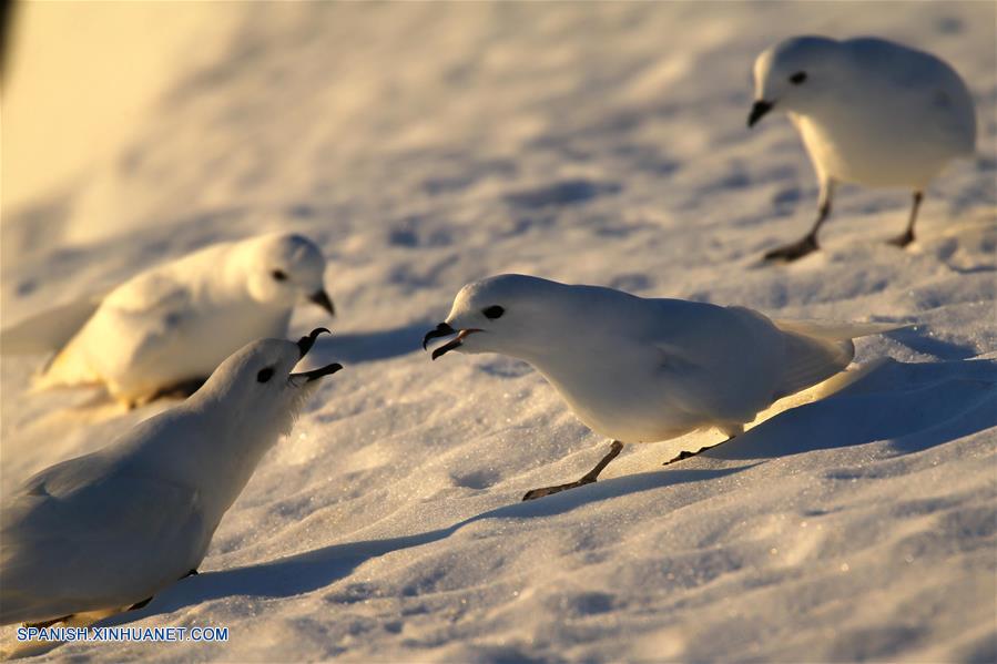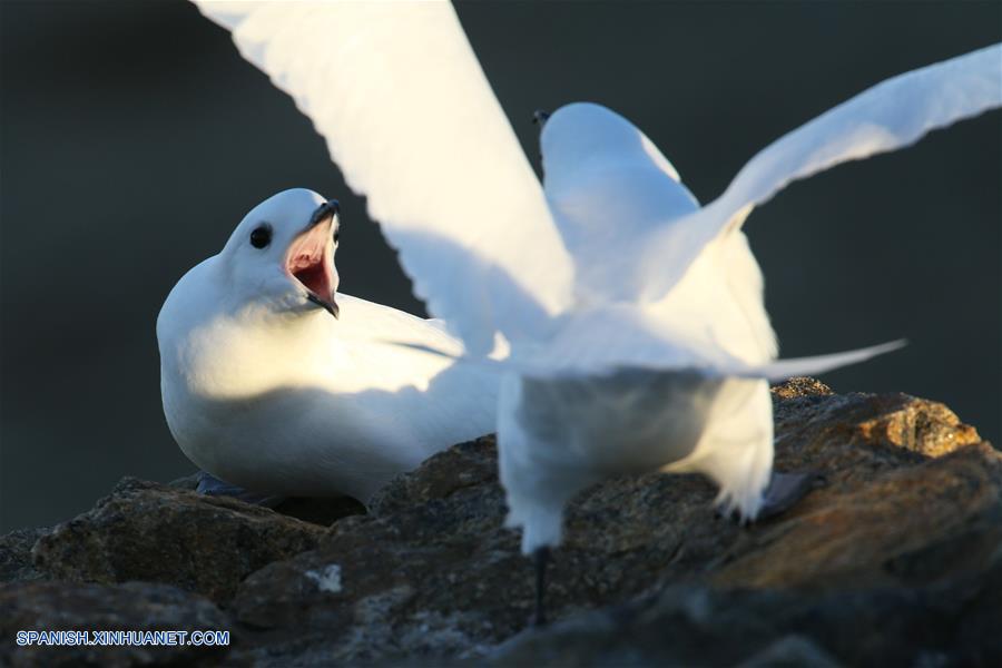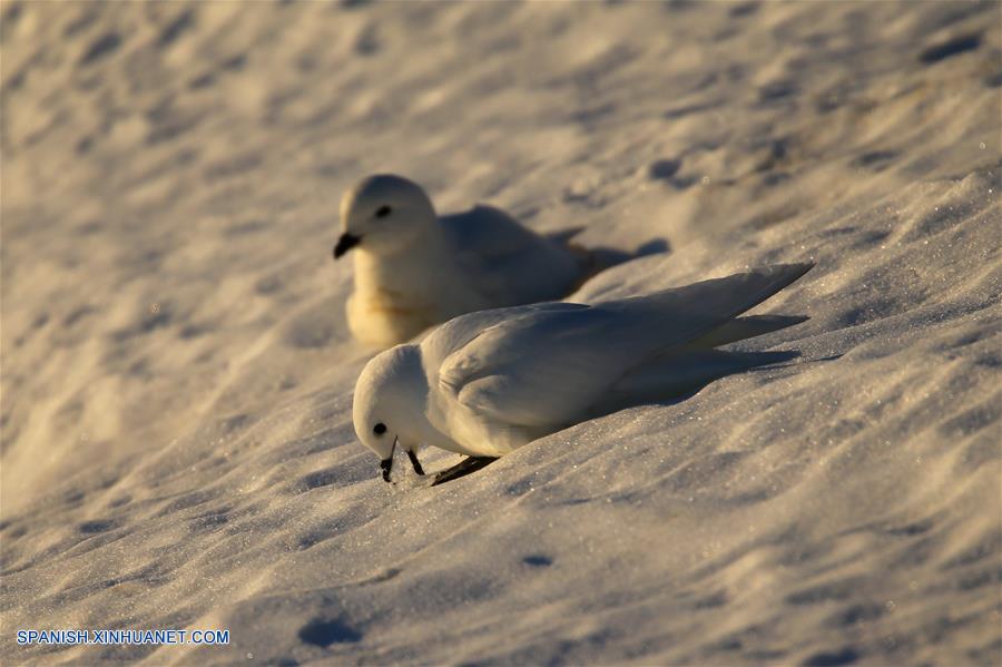 A BORDO DEL XUELONG, diciembre 12, 2018 (Xinhua) -- Imagen del 9 de diciembre de 2018 de una vista de petreles níveos captados cerca de la estación Zhongshan en la Antártida. El rompehielos de investigación Xuelong de China, también conocido como Dragón de Nieve, está ahora a 44 kilómetros de la estación Zhongshan. Las operaciones de descarga se llevaron a cabo una vez determinadas las rutas de transporte. (Xinhua/Liu Shiping)