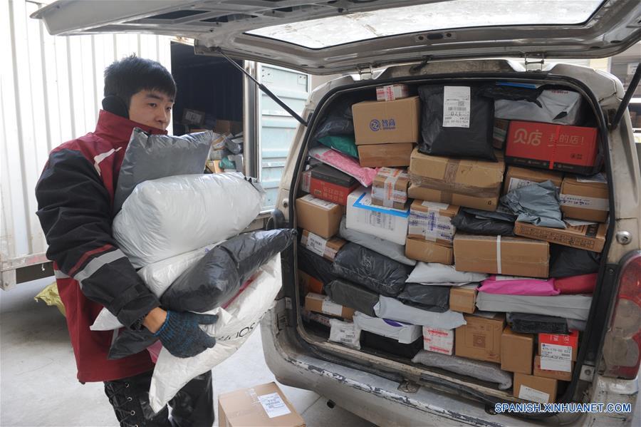 ANHUI, diciembre 12, 2018 (Xinhua) -- Un empleado de una compa?ía de entrega urgente carga paquetes en una camioneta, en Fuyang, provincia de Anhui, en el este de China, el 12 de diciembre de 2018. Al caer el 12 de diciembre, el festival de compras en línea "Doble 12" ha brindado mayores oportunidades de negocios al comercio electrónico y las empresas de logística de China. (Xinhua/Wang Biao)