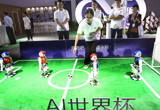 Cuatro robots juegan al fútbol en el stand de Huawei durante una exposición en Beijing. [Foto: proporcionada]