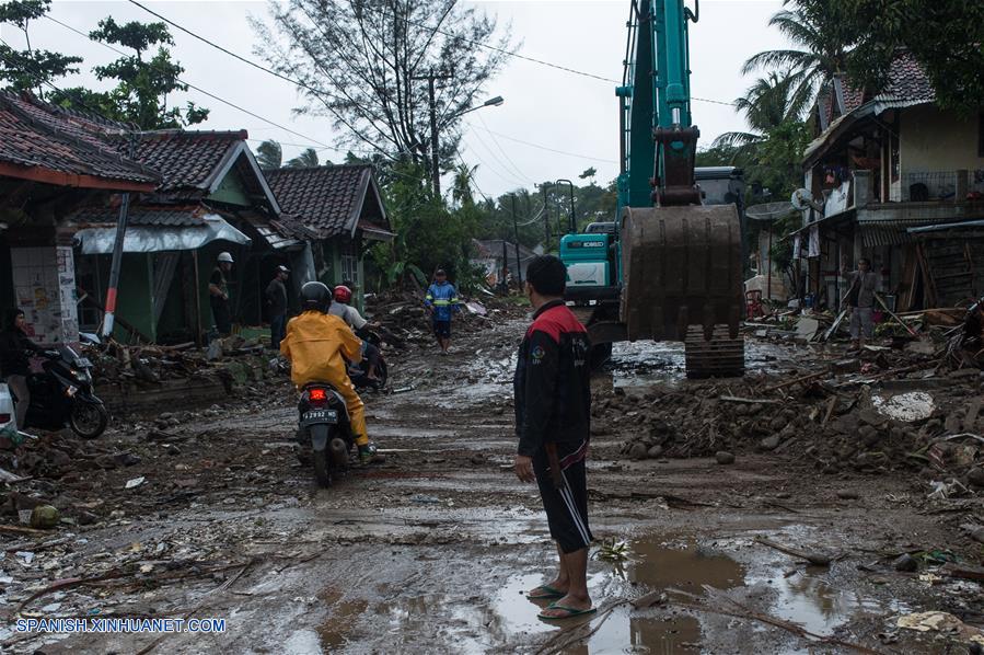 BANTEN, diciembre 23, 2018 (Xinhua) -- Una retroexcavadora limpia un camino de escombros luego de que un tsunami alcanzara el Estrecho de la Sonda, en Pandeglang, provincia de Bantén, Indonesia, el 23 de diciembre de 2018. Las muertes por un tsunami ocasionado por una erupción volcánica en Indonesia llegaron a 222 con al menos 843 heridos, informó el domingo la agencia para el manejo de desastres. La erupción del volcán Anak Krakatau, o Child of Krakatoa en inglés, provocó el sábado deslizamientos submarinos de tierra ocasionando el aumento del nivel del mar el sábado en la noche, de acuerdo con la agencia de meteorología y geofísica. El tsunami destruyó 556 casas, nueve hoteles y 360 barcos en el distrito de Pandeglang, el área más afectada, así como la provincia de Serang of Bantén y el distrito de Lampung Selatan en la provincia de Lampung, dijo el vocero de la agencia nacional para el manejo de desastres, Sutopo Purwo Nugroho. (Xinhua/Veri Sanovri)
