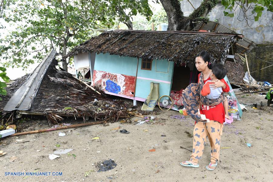 BANTEN, diciembre 23, 2018 (Xinhua) -- Una mujer sosteniendo a su bebé camina frente a escombros cerca de una playa en Carita luego de que un tsunami alcanzara el Estrecho de la Sonda, en Pandeglang, provincia de Bantén, Indonesia, el 23 de diciembre de 2018. Las muertes por un tsunami ocasionado por una erupción volcánica en Indonesia llegaron a 222 con al menos 843 heridos, informó el domingo la agencia para el manejo de desastres. La erupción del volcán Anak Krakatau, o Child of Krakatoa en inglés, provocó el sábado deslizamientos submarinos de tierra ocasionando el aumento del nivel del mar el sábado en la noche, de acuerdo con la agencia de meteorología y geofísica. El tsunami destruyó 556 casas, nueve hoteles y 360 barcos en el distrito de Pandeglang, el área más afectada, así como la provincia de Serang of Bantén y el distrito de Lampung Selatan en la provincia de Lampung, dijo el vocero de la agencia nacional para el manejo de desastres, Sutopo Purwo Nugroho. (Xinhua/Wahyu Wening)
