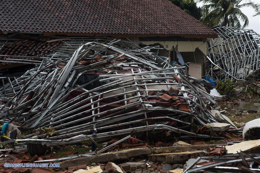 BANTEN, diciembre 23, 2018 (Xinhua) -- Un vehículo permanece en medio de los escombros luego de que un tsunami alcanzara el Estrecho de la Sonda, en Pandeglang, provincia de Bantén, Indonesia, el 23 de diciembre de 2018. Las muertes por un tsunami ocasionado por una erupción volcánica en Indonesia llegaron a 222 con al menos 843 heridos, informó el domingo la agencia para el manejo de desastres. La erupción del volcán Anak Krakatau, o Child of Krakatoa en inglés, provocó el sábado deslizamientos submarinos de tierra ocasionando el aumento del nivel del mar el sábado en la noche, de acuerdo con la agencia de meteorología y geofísica. El tsunami destruyó 556 casas, nueve hoteles y 360 barcos en el distrito de Pandeglang, el área más afectada, así como la provincia de Serang of Bantén y el distrito de Lampung Selatan en la provincia de Lampung, dijo el vocero de la agencia nacional para el manejo de desastres, Sutopo Purwo Nugroho. (Xinhua/Veri Sanovri)