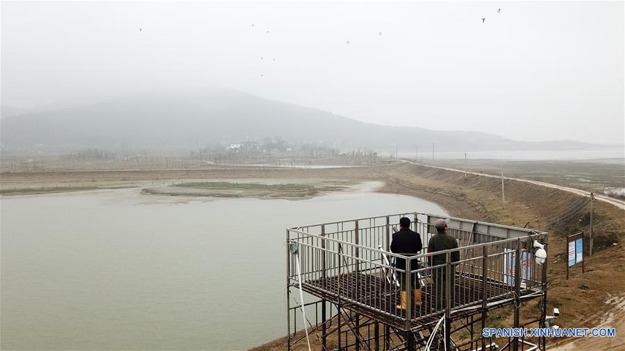 ANHUI, diciembre 23, 2018 (Xinhua) -- Imagen del 22 de diciembre de 2018, de una vista aérea de Wang Sanyi (i) observando aves migratorias en el humedal del Lago Caizi, en Anqing, en la provincia de Anhui, en el este de China. Wang Sanyi, de 69 a?os de edad, fundó la asociación de protección ecológica en el humedal del Lago Caizi con más de 300 miembros en 2010. Algunos pobladores que solían ser cazadores, ahora forman parte de la asociación como voluntarios para proteger a las aves migratorias. Con la ayuda de la asociación, el ambiente ecológico del humedal del Lago Caizi ha mejorado desde hace unos a?os. Gracias a los esfuerzos de protección, más aves migratorias son vistas hibernando. "Proteger el humedal y a las aves migratorias, siempre me llena de alegría," dijo Wang Sanyi. "Espero ver más voluntarios participando en los trabajos de protección." (Xinhua/Zhang Duan)