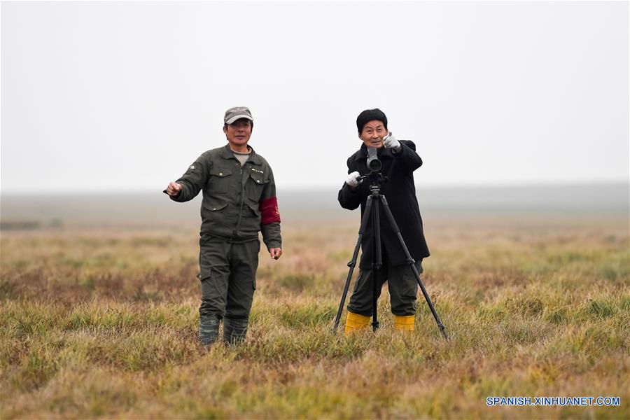 ANHUI, diciembre 23, 2018 (Xinhua) -- Imagen del 22 de diciembre de 2018, de Wang Sanyi (i) observando aves migrantes en el humedal del Lago Caizi, en Anqing, en la provincia de Anhui, en el este de China. Wang Sanyi, de 69 a?os de edad, fundó la asociación de protección ecológica en el humedal del Lago Caizi con más de 300 miembros en 2010. Algunos pobladores que solían ser cazadores, ahora forman parte de la asociación como voluntarios para proteger a las aves migratorias. Con la ayuda de la asociación, el ambiente ecológico del humedal del Lago Caizi ha mejorado desde hace unos a?os. Gracias a los esfuerzos de protección, más aves migratorias son vistas hibernando. "Proteger el humedal y a las aves migratorias, siempre me llena de alegría," dijo Wang Sanyi. "Espero ver más voluntarios participando en los trabajos de protección." (Xinhua/Zhang Duan)