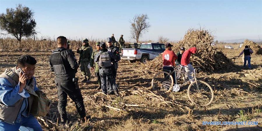 Imagen tomada con un dispositivo móvil de elementos de la Policía Federal trabajando en el área donde se desplomó la avioneta donde viajaban la gobernadora del estado de Puebla, Martha Erika Alonso, y el senador y ex gobernador Rafael Moreno Valle, en el municipio de Coronango, estado de Puebla, México, el 24 de diciembre de 2018. El líder del Partido Acción Nacional (PAN) de México, Marko Cortés, confirmó el lunes la muerte de la gobernadora del estado de Puebla, Martha Erika Alonso, y del senador y ex gobernador Rafael Moreno Valle, durante un accidente aéreo. (Xinhua/Antonio Rivas)