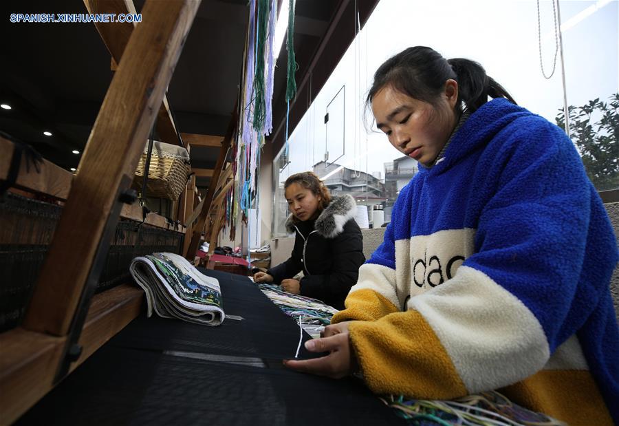 Una mujer teje un tapiz del grupo étnico Tujiahecho para el próximo mercado turista por el A?o Nuevo en el distrito Wulingyuan, de la ciudad Zhangjiajie, en la provincia Hunan, en el centro de China, el 24 de diciembre de 2018. La tapicería tejida por el grupo étnico Tujia fue registrada en la lista del patrimonio intangible de la herencia cultural nacional en 2006. (Xinhua/Wu Yongbing) (Xinhua/Str)