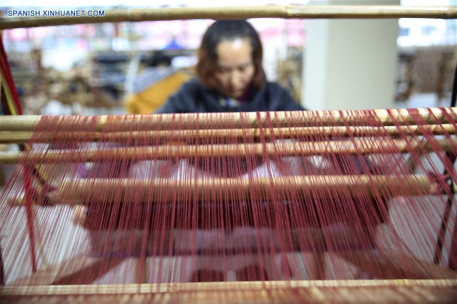 Un trabajador teje un tapiz del grupo étnico Tujiahecho para el próximo mercado turista por el A?o Nuevo en el distrito Wulingyuan, de la ciudad Zhangjiajie, en la provincia Hunan, en el centro de China, el 24 de diciembre de 2018. La tapicería tejida por el grupo étnico Tujia fue registrada en la lista del patrimonio intangible de la herencia cultural nacional en 2006. (Xinhua/Wu Yongbing) (Xinhua/Str)
