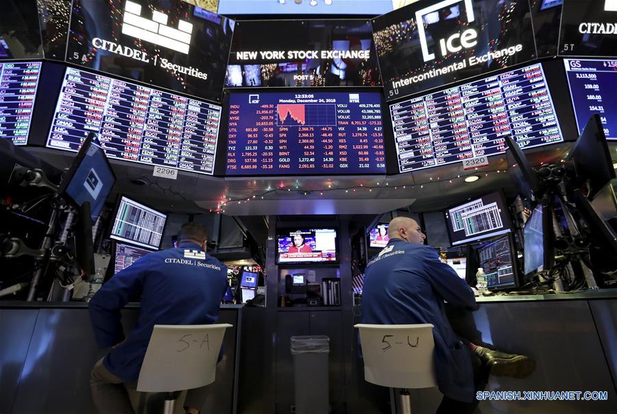 Comerciantes trabajan en la Bolsa de Valores de Nueva York, en Nueva York, Estados Unidos, el 24 de diciembre de 2018. Wall Street cerró el lunes con enormes pérdidas y la mayoría de los principales índices registraron su peor víspera de Navidad, con lo que extendieron las pérdidas de la semana anterior. El Promedio Industrial Dow Jones perdió 653.17 puntos, o 2.91 por ciento, para terminar en 21,792.20 unidades. El índice Standard & Poor's 500 cayó 65.52 puntos, o 2.71 por ciento, para ubicarse en 2,351.10 unidades. El índice compuesto Nasdaq disminuyó 140.08 puntos, o 2.21 por ciento, para cerrar en 6,192.92 unidades. (Xinhua/Wang Ying)