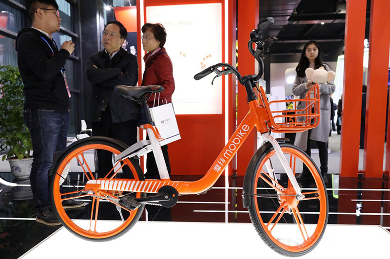 Una bicicleta Mobike se exhibe durante una exposición de alta tecnología en Wuzhen, provincia de Zhejiang. [Foto: Zhu Xingxin/ China Daily]