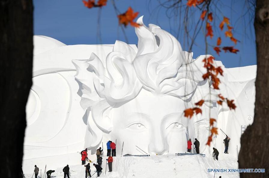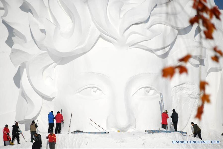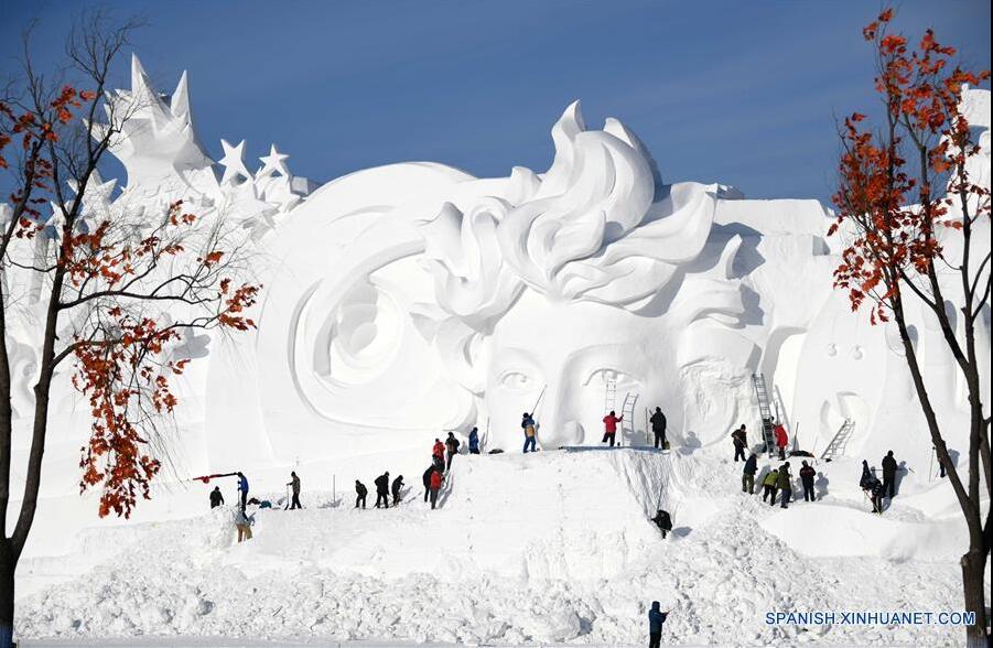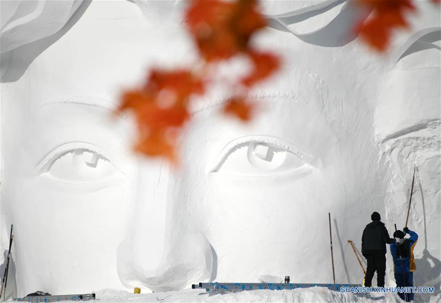 HEILONGJIANG, diciembre 24, 2018 (Xinhua) -- Escultores tallan una escultura de nieve en el Parque Internacional de Exposiciones de Arte de Escultura de Nieve Isla del Sol, en Harbin, capital de la provincia de Heilongjiang, en el noreste de China, el 24 de diciembre de 2018. La escultura de nieve, la atracción principal para la exposición de arte de escultura de nieve, es de 32 metros de alto. (Xinhua/Wang Jianwei)