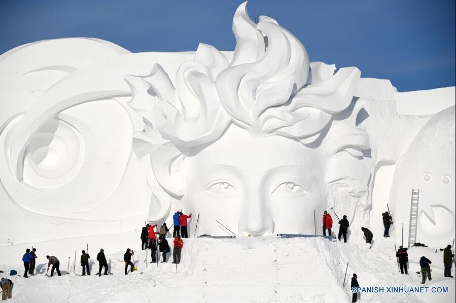 Escultores tallan una escultura de nieve en el Parque Internacional de Exposiciones de Arte de Escultura de Nieve Isla del Sol, en Harbin, capital de la provincia de Heilongjiang, en el noreste de China, el 24 de diciembre de 2018. La escultura de nieve, la atracción principal para la exposición de arte de escultura de nieve, es de 32 metros de alto. (Xinhua/Wang Jianwei)
